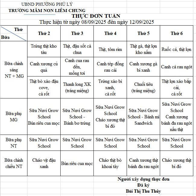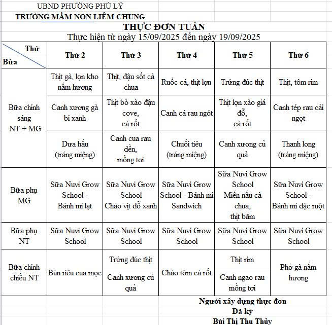 Thực đơn tháng 9 năm học 2025-2026 Trường Mầm non Liêm Chung